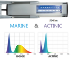 Wyposażenie techniczne stanowi podwójna, nowoczesna lampa LEDDY SLIM DUO MARINE&ACTINIC. Jej zastosowanie umożliwia uzyskanie wyjątkowego efektu dekoracyjnego oraz dużą oszczędność wynikającą z niskiego zużycia energii elektrycznej oraz braku konieczności częstego wymieniania źródła światła. Lampa zawiera dwa rzędy diod o łącznej mocy 10 W. Połowę stanowią diody MARINE, emitujące silne, białe światło o temperaturze barwowej 10000 K, zapewniające dobry rozwój koralowców. Pozostałe diody ACTINIC emitują niebieskie światło o temperaturze barwowej 20000 K, które podkreśla barwy zwierząt morskich.