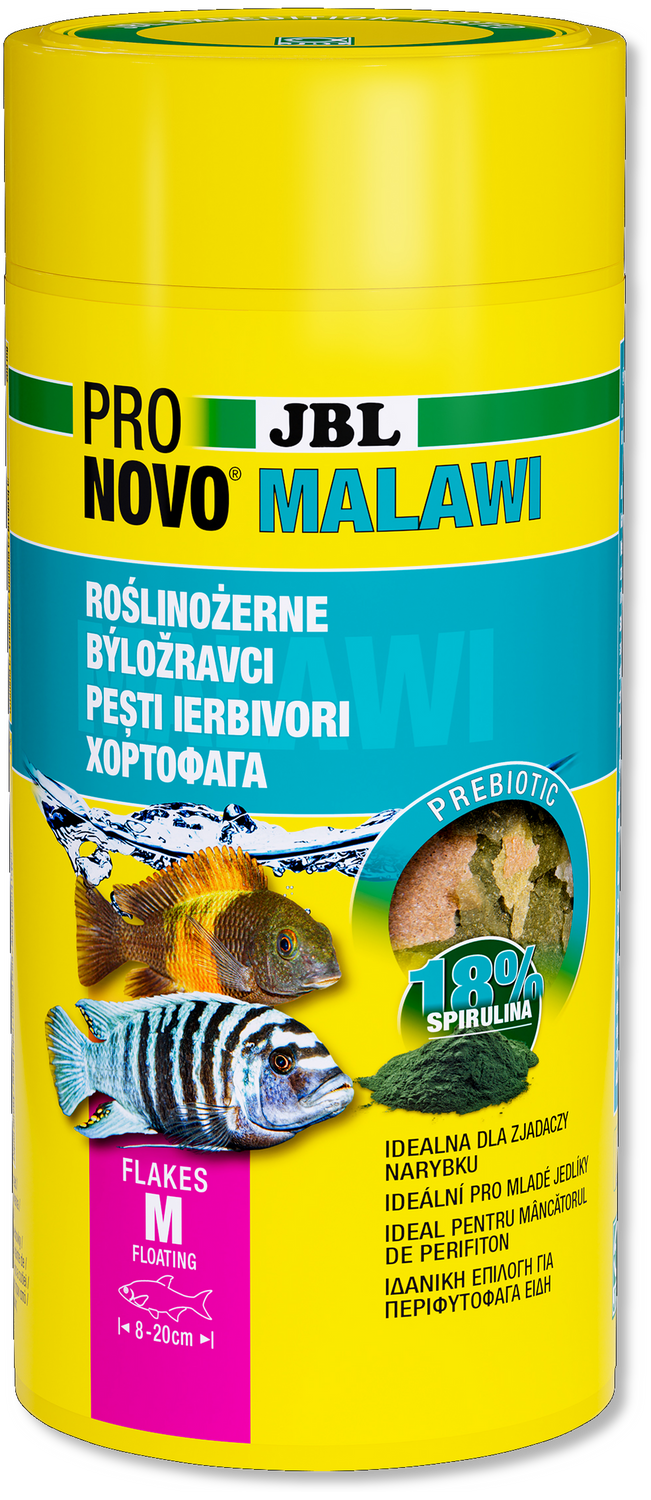 Ponieważ większość hodowanych gatunków z Jeziora Malawi są to ryby zjadające porosty, firma JBL nazwała ten pokarm PRONOVO MALAWI.