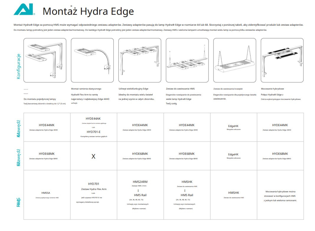 Tylny uchwyt pochylanyTylny uchwyt z możliwością pochylenia umożliwia przymocowanie lampy Hydra® Edge do zestawu HMS™ Single Arm Kit, co pozwala na precyzyjną regulację kąta padania światła, idealnie dostosowując go do unikalnych wymagań akwarium. | Uchwyt z górnym pochyleniemGórny uchwyt pochylany umożliwia przymocowanie Hydra® Edge do szyny HMS™, zapewniając elastyczność ustawienia świateł pod odpowiednim kątem, aby idealnie oświetlić akwarium. | Zestaw do zawieszaniaZestaw do zawieszania Hydra® Edge to eleganckie i wyrafinowane rozwiązanie umożliwiające zawieszenie lampy nad zbiornikiem. |