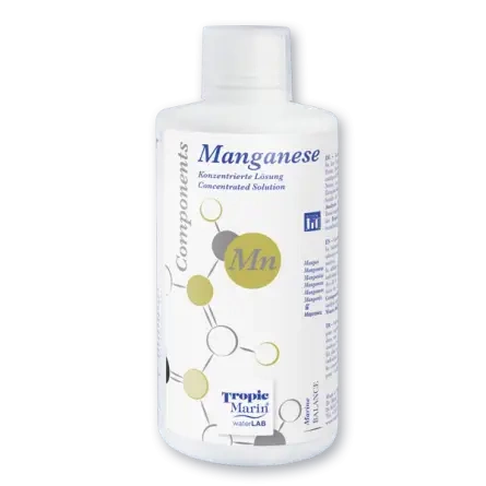 Mangan jest metalem przejściowym i jako pierwiastek śladowy pełni ważne funkcje w enzymach. Jest szczególnie zaangażowany w reakcje z tlenem i w jego obecności. Mangan jest nierównomiernie rozłożony w oceanie, ponieważ przedostaje się do morza głównie w postaci pyłu unoszonego przez wiatr lub przez dopływające rzeki, a następnie osadza się w postaci cząstek. W akwariach rafowych szybko się wytrąca, często poniżej granicy wykrywalności.