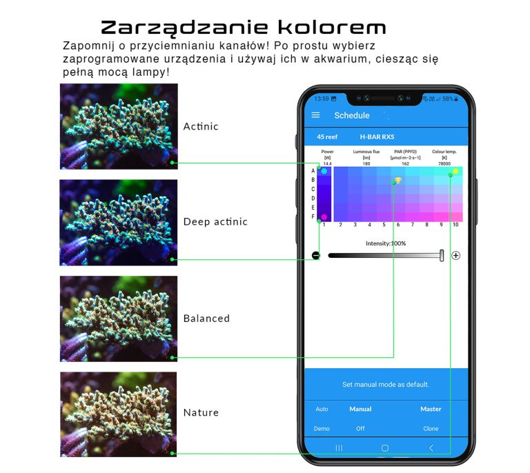 Dodatkowo są to najprawdopodobniej jedyne dostępne obecnie na świecie lampy, w których zmiana barwy nie wymaga wyłączania białych, czerwonych ani zielonych kanałów. Lampy fabrycznie ustawione są w trybie „Blue” – pełne spektrum od fioletu do błękitu – a dodanie białego światła z poziomu aplikacji nie powoduje zmiany PAR ani mocy lampy.