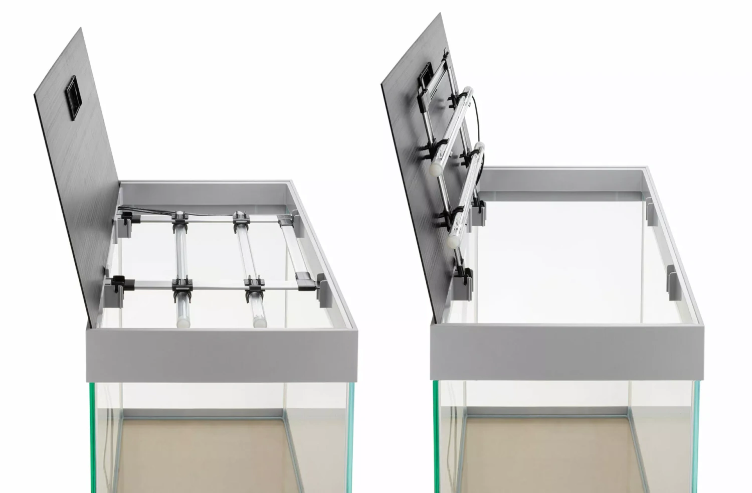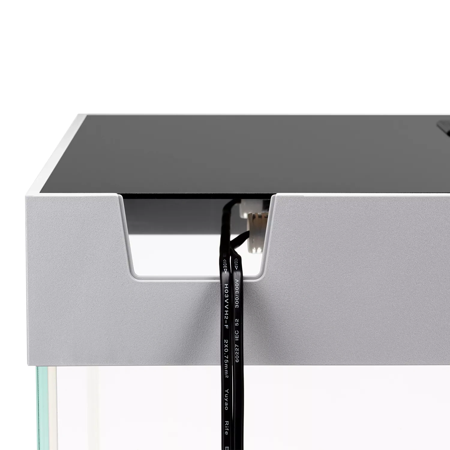 Rama doskonale komponuje się też z elegancką pokrywą, wyposażoną w opatentowany system  Smart Open. System ten umożliwia łatwe otwarcie i zatrzymanie pokrywy w pożądanej pozycji. W pokrywie umieściliśmy zamykane okienko, przez które wygodnie nakarmisz ryby. Otwory techniczne na tylnej ścianie akwarium przeznaczone są na węże filtra zewnętrznego. Poprowadzisz tam także przewody służące do zasilania urządzeń elektrycznych akwarium. Koniec z nieestetycznie wiszącymi kablami!